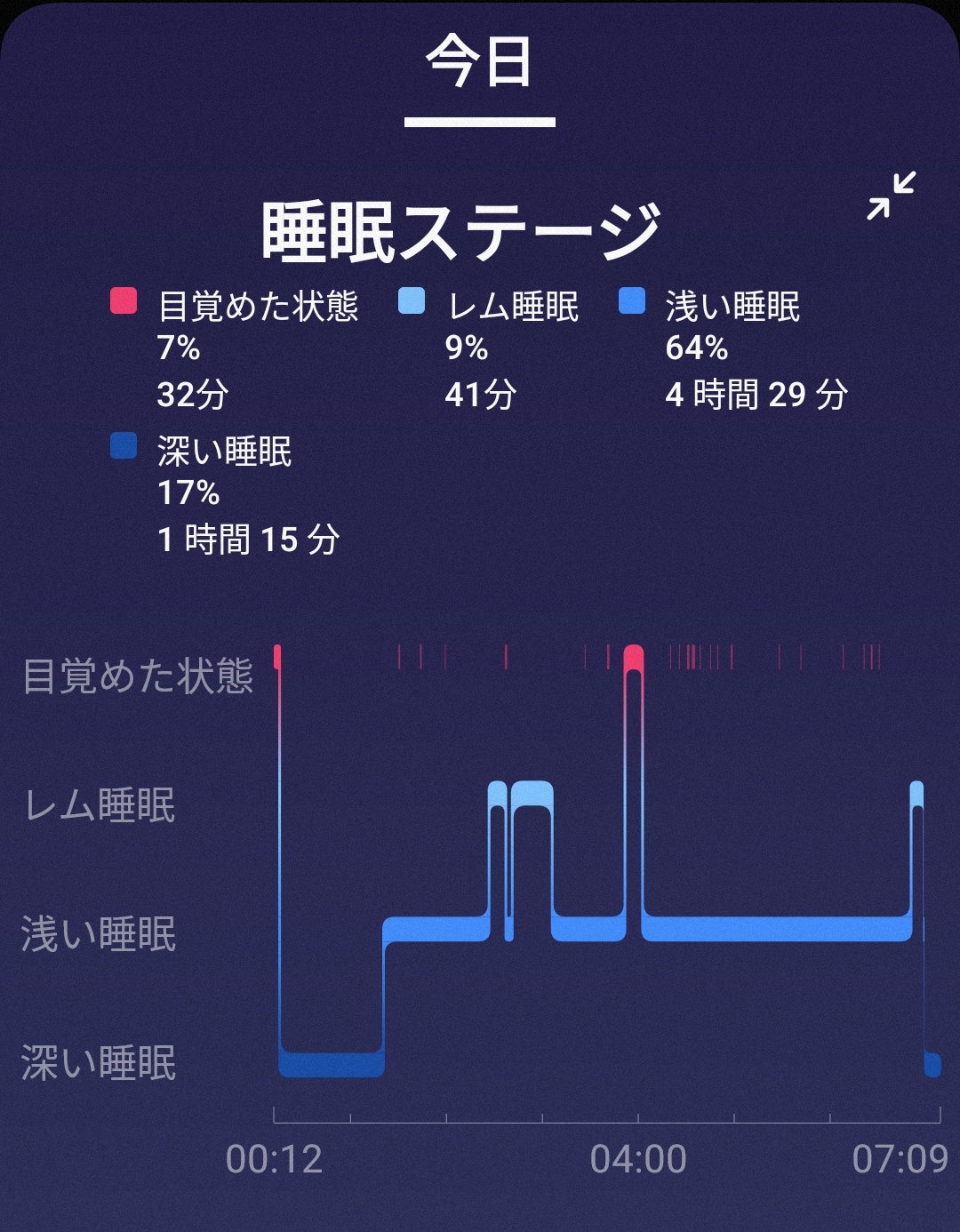 もっとも、睡眠は日によっていろいろなので、こんな風に入眠直後に深い睡眠が長い時間取れることは少ないですが