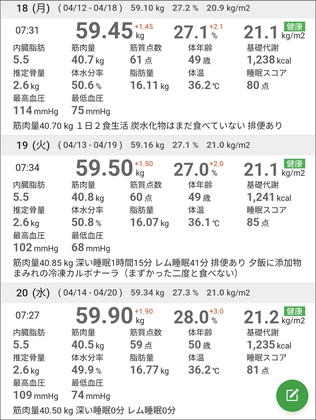 一晩寝たら体脂肪率が1%も増えていてガックリきました _| ̄|○