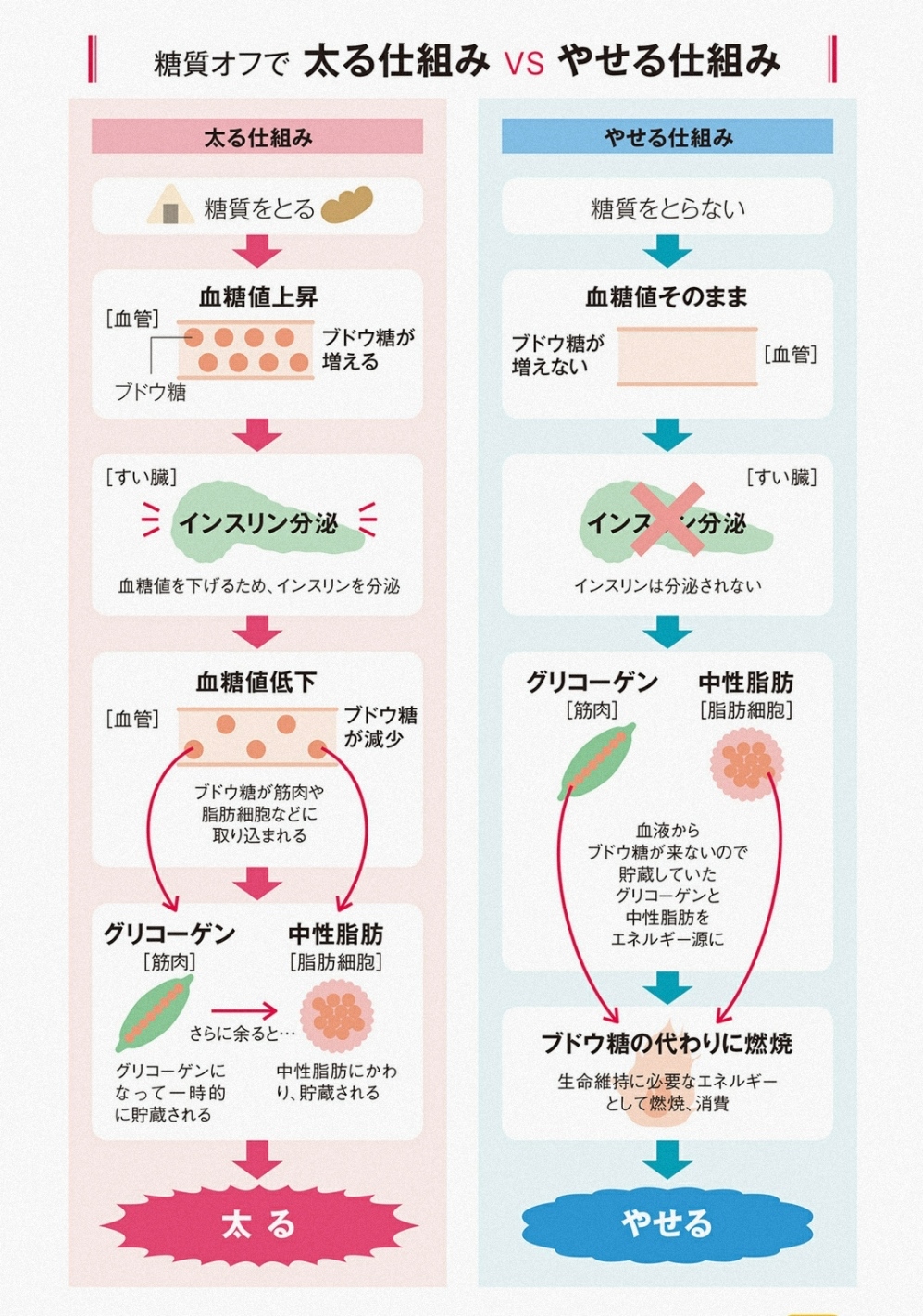 そこで学習したのですが、糖質を摂取して血糖値が上がると、体に蓄えられている脂肪細胞が燃焼することがないため、痩せないんですね。
