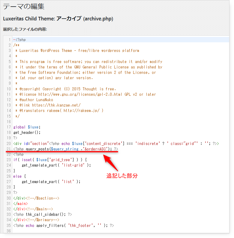 ルクセリタス子テーマでアーカイブ表示順を古い順に変更する