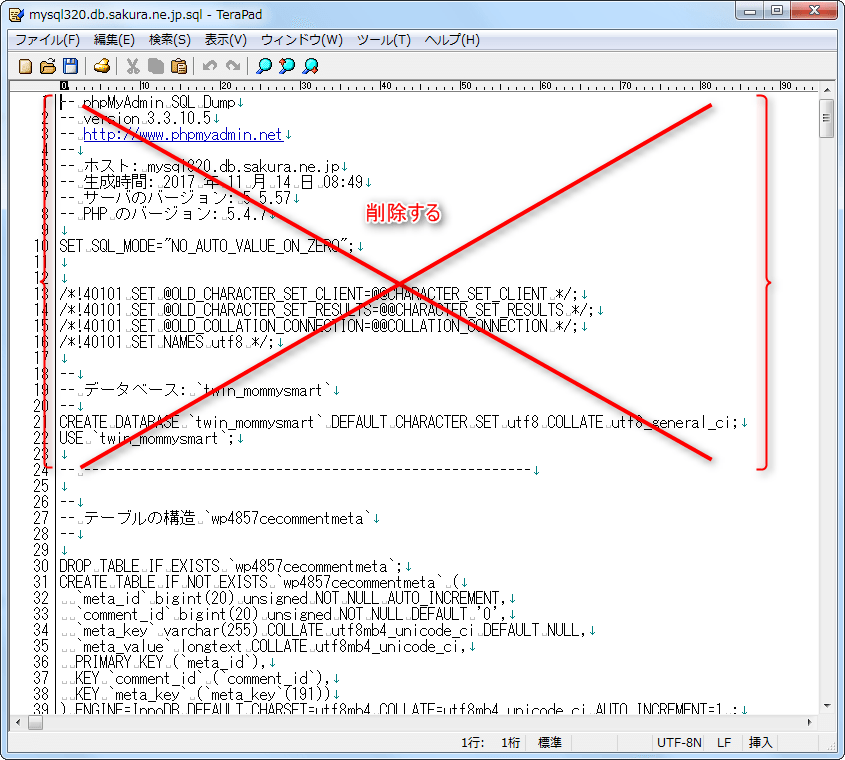 削除する部分の記述は、移転先のデータベースに復元する際、不要になります。