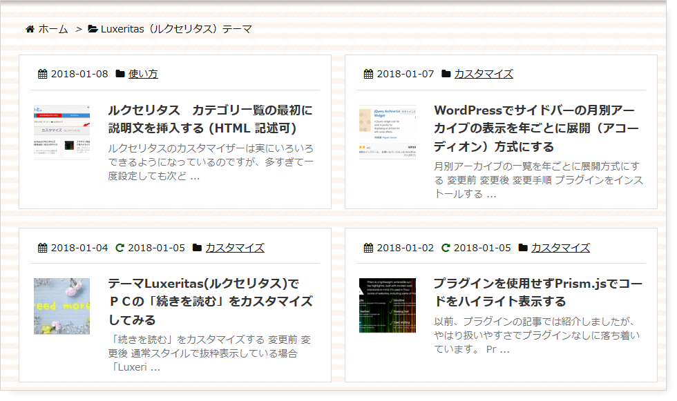 今回は、ルクセリタスの記事の一覧表示として選択できる「カード型」の見た目をプチカスタマイズしました。