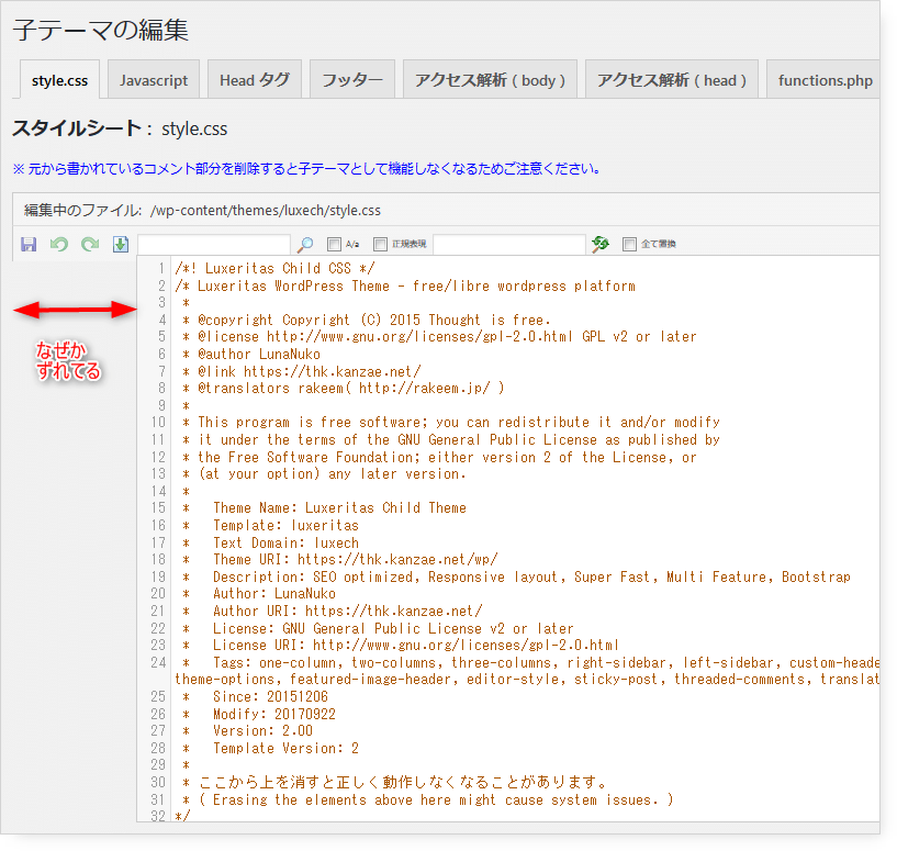表示と言えば、かなり前から、ルクセリタスの子テーマの編集画面はこんなことになったままです。