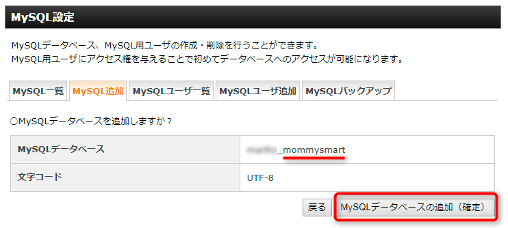 - 「MySQL追加」タブを開き、データベース名を半角16文字以内で入力し、「追加(確認)」ボタンをクリックする。