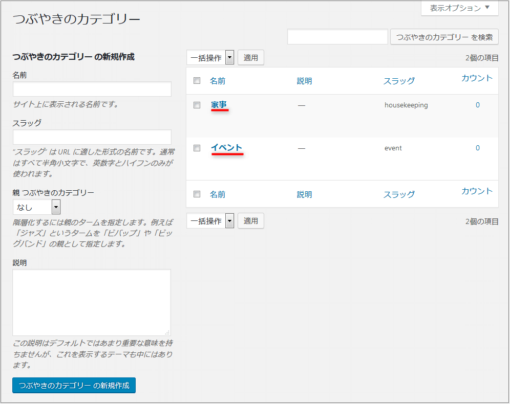 通常投稿のカテゴリーを作るのと同じ要領で、「つぶやき」にカテゴリーを作成します。 ここでは、2つのカテゴリーを作りました。